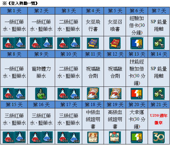 (2)活動期間內累積登入即可會得各式好禮,累積滿21天後更可獲得聯名限定徽章『UJ30週年徽章』。
