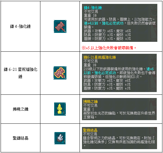 ※『鑄』系列強化錘在使用時仍然有機率確認提示,只要在強化值以內的裝備皆可使強化成功,若裝備強化值超過『鑄』系列強化錘則以顯示機率為準!